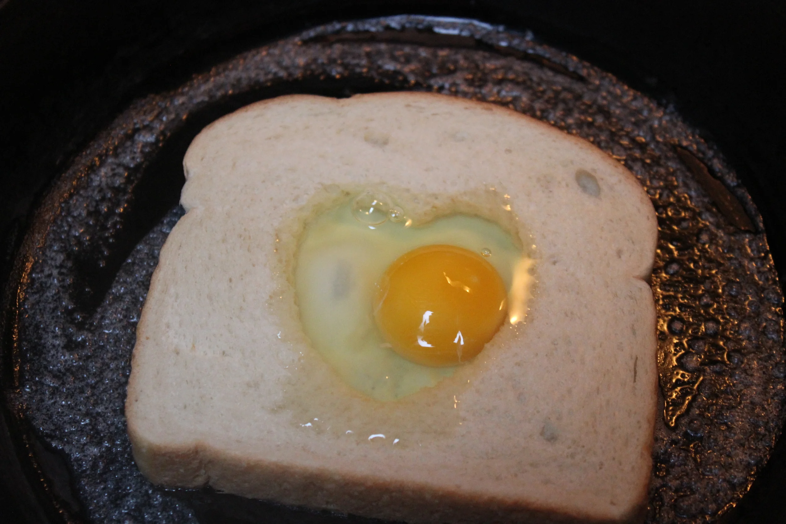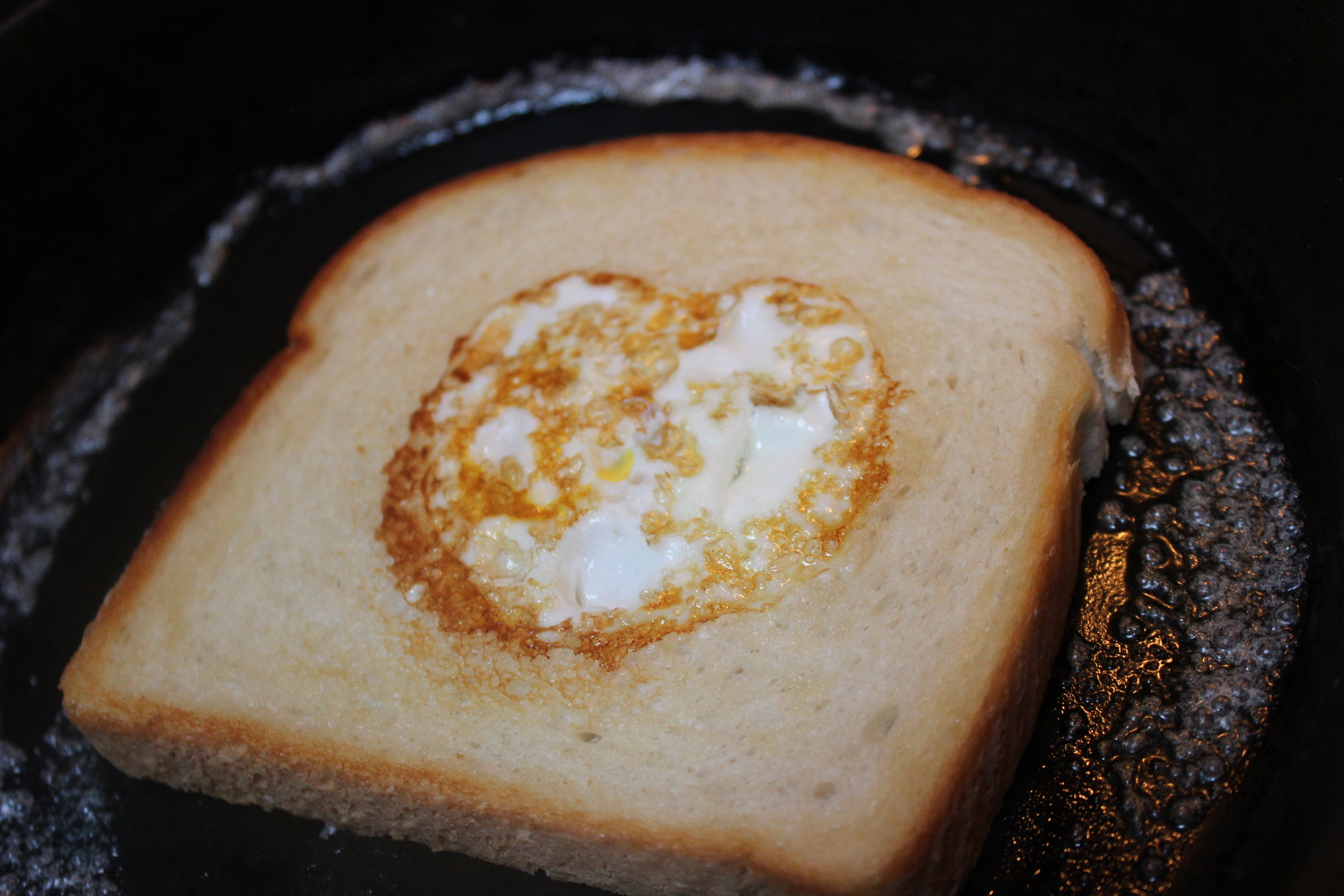 • Cut a hole in your piece of bread and chuck it on the hot buttered skillet {I was using sourdough because the Alaska just never goes out of my system}